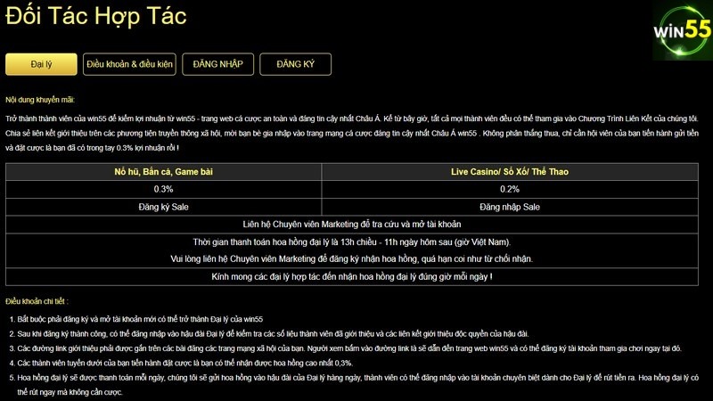 Một cách khác để Win55 đưa ra dịch vụ của mình đến với nhiều người chơi, mở rộng mạng lưới hoạt động nhanh chóng là mời thêm các đối tác. Khi trở thành đại lý chúng ta sẽ sử dụng trang mạng xã hội, website riêng của mình để thu hút khách hàng, quảng cáo cho nhà cái và trực tiếp nhận chiết khấu hoa hồng khủng tới 60%.